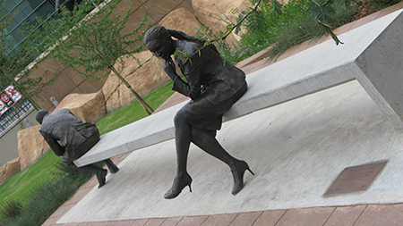 When RMB was one year later approached by the Sandton Central Bench Mark Project to create urban furniture that would make the area (of Sandton) more welcoming, the idea to use the two Thinkers as part of a bench came to mind. Olivier was once again commissioned — this time round to sculpt two life-size artworks of the Thinkers on a 6m concrete ‘floating’ bench. The project became a two-year project from design to delivery and the two figures alone took six months at the Renzo Bignali Artiscti Foundry in Pretoria. Today the two Thinkers are proudly adorning the pavement of Fredman drive — offering a comfortable seat to passersby waiting for transport and otherwise enjoyed by RMB staff and clients entering the Sandton campus.